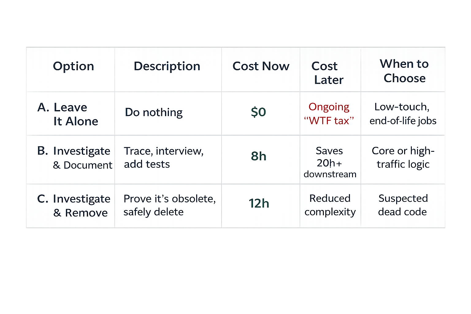 If ten developers touch an undocumented transformation twice a year, Option B quickly becomes cheaper.